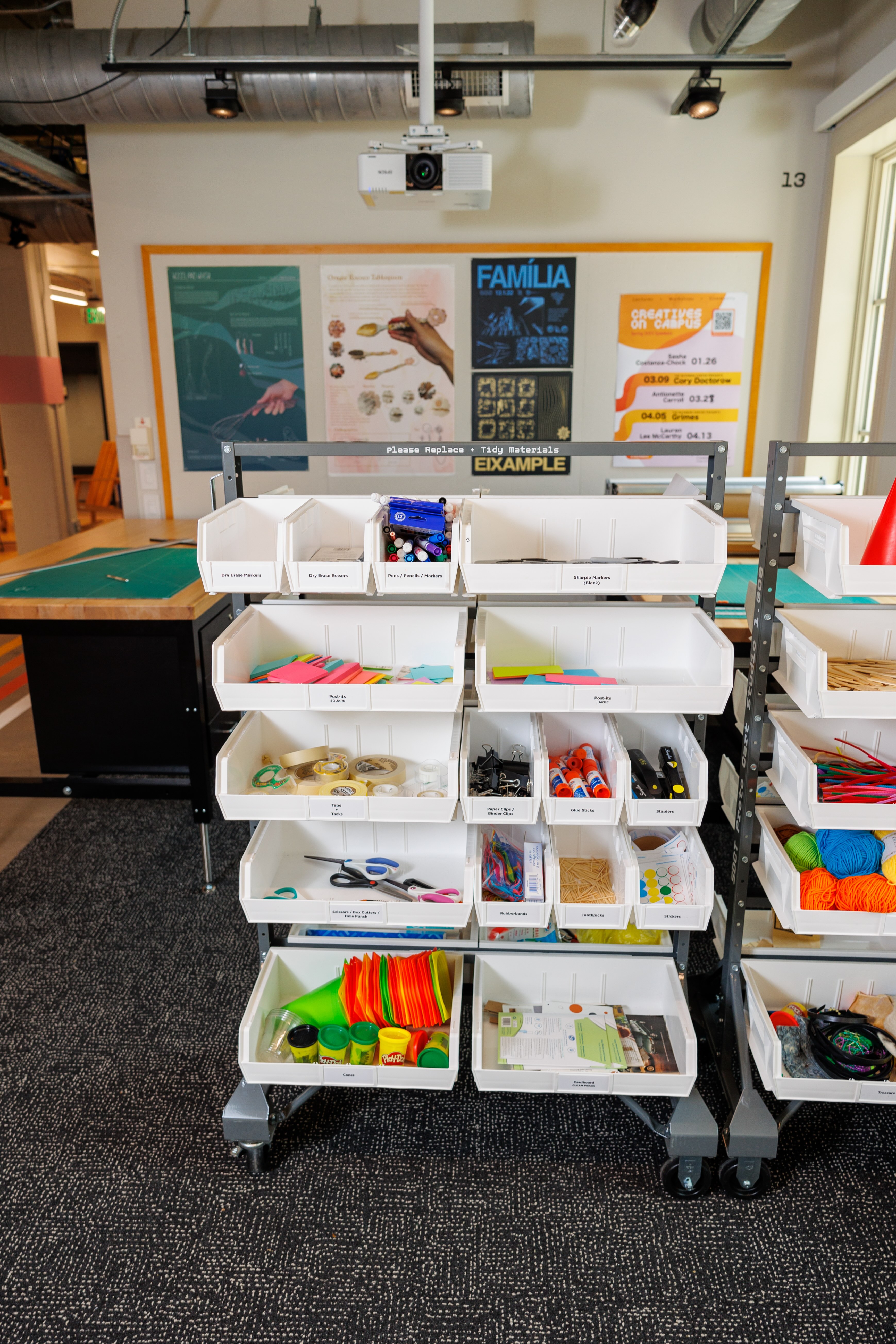These protocarts, first housed in the classrooms, were placed into the commons area, for people to use and make with.